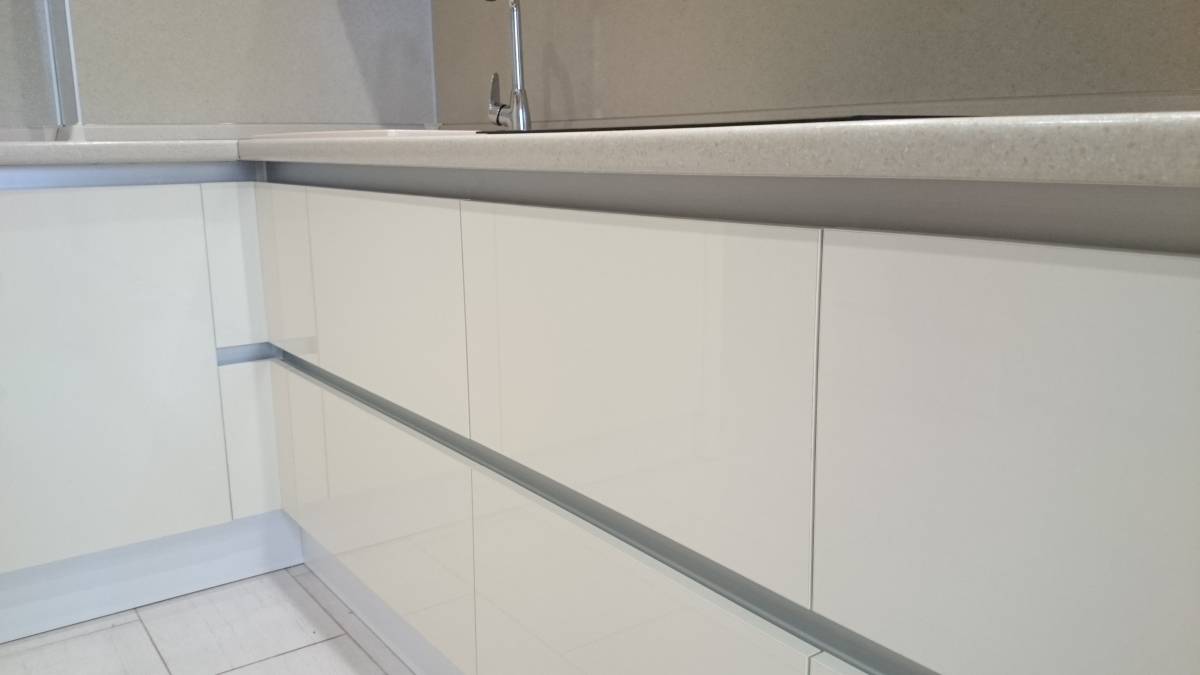 | Рис. 4. Алюминиевые профиль-ручки в цвете белый глянец сливаются с белыми фасадами кухни |