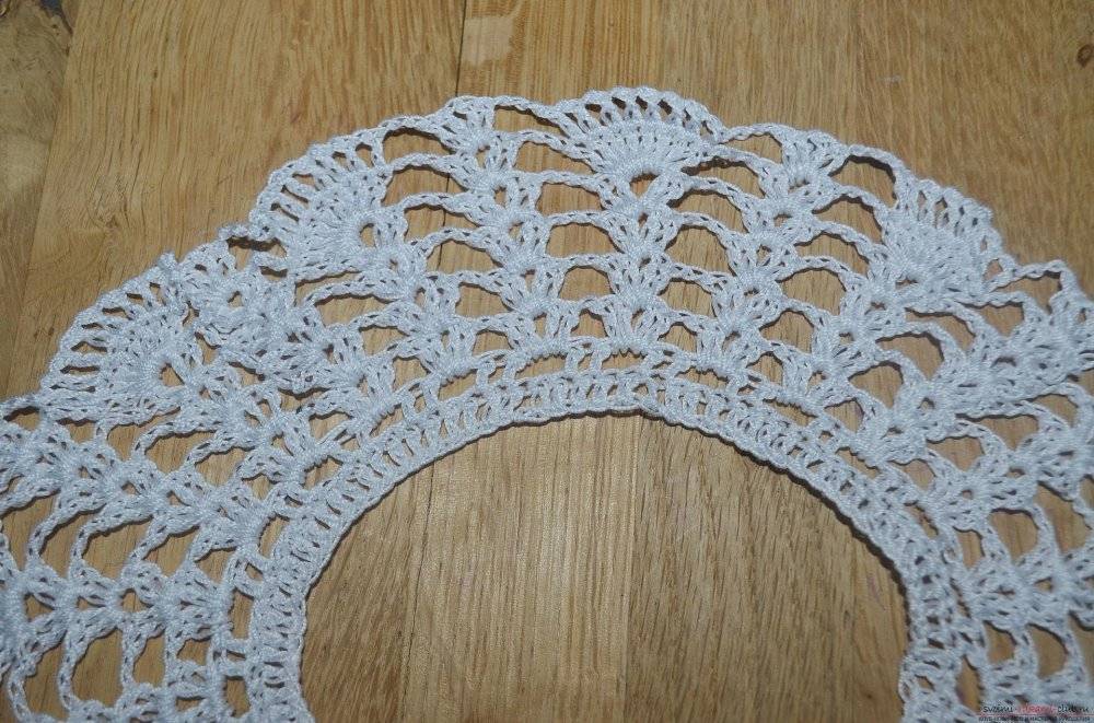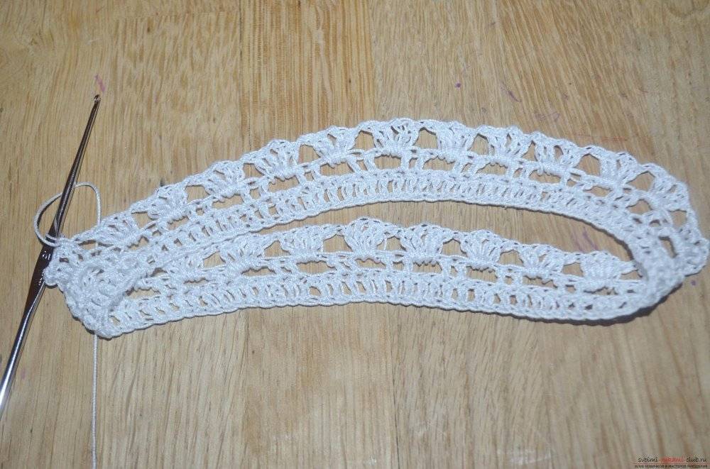 Готовая накидка напоминает небольшую вязаную скатерть. Правда, тематическому изделию придется задать форму для качественной посадки на каркас. Форма задается путем вдевания проволочных колец в накидку с ее последующим ручным или утюжным прессованием.