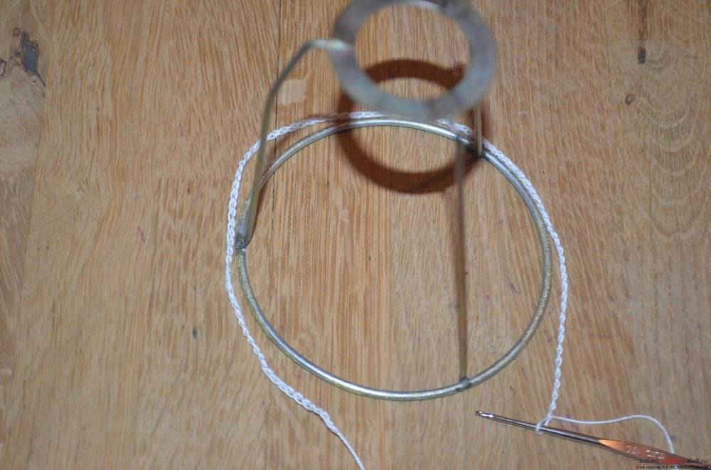 За основу берут каркас от старой люстры либо деревянный, металлический обод. Если ничего подходящего под руками нет, можно сделать несколько мотков их стальной проволоки, подготовив круг. Пошаговая инструкция: