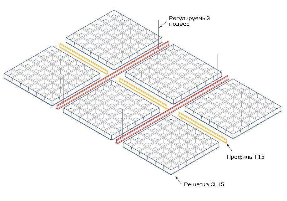 Все решетки монтируются в ячейки системы Т-15. Благодаря этому достигается быстрота монтажа и возможность быстрой замены отдельных элементов и модернизации конструкции сетчатого потолка.