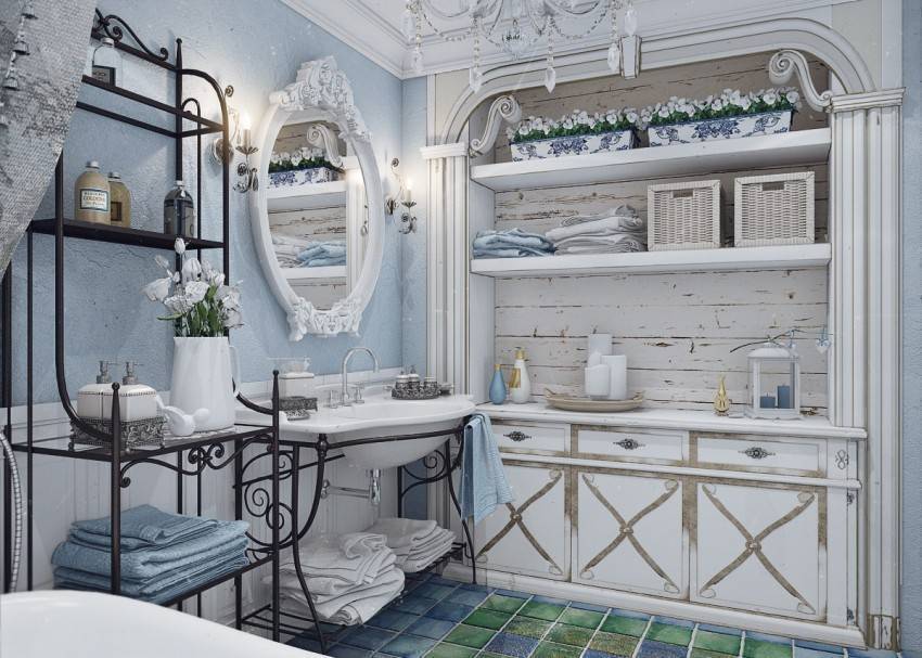 Одним из наиболее популярных современных вариантов дизайна ванной комнаты является стиль прованс. Он предполагает наличие таких деталей, как: