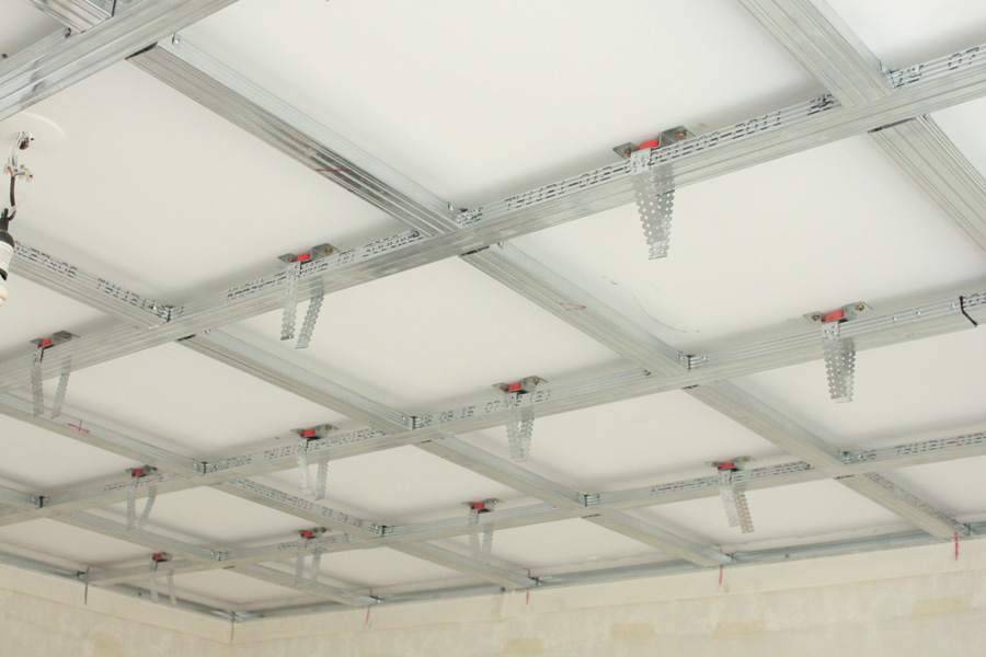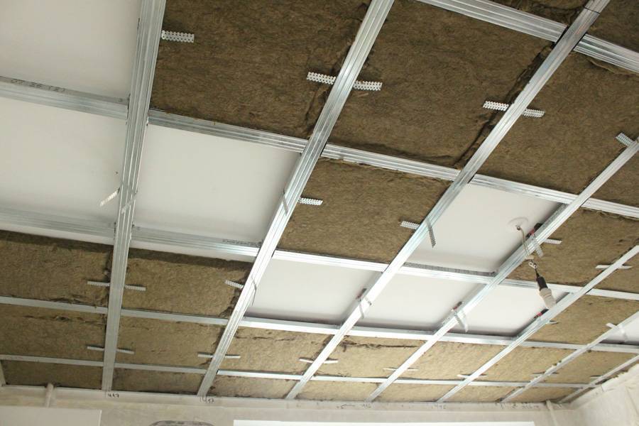 - Если используется массивная шумоизоляция потолка, монтируют усиленный каркас (в виде сетки).