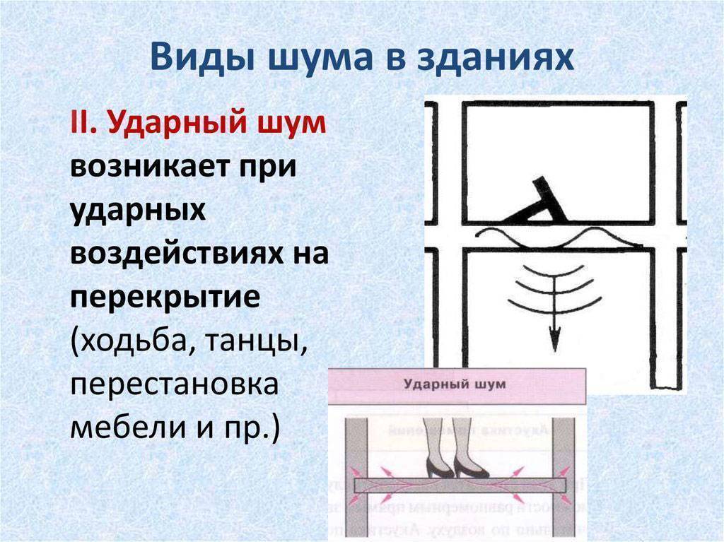 - Вибрационные. Делятся на два подтипа. К структурным шумам относятся звуки лифтовых механизмов, вентиляции, воды в трубах и т. п. К ударным — например, работающий перфоратор, стуки или шаги. Они распространяются по перекрытиям, поэтому могут быть слышны не только в соседнем помещении.