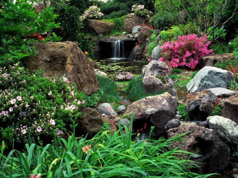 Очень эффектно альпийская горка смотрится, если в ее композицию включен пруд.