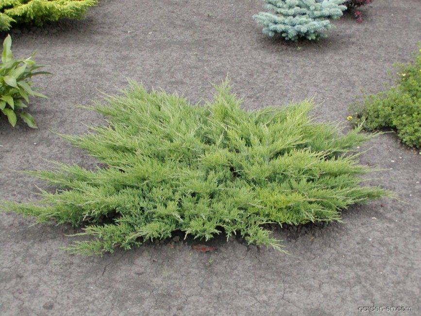 Лучше всего для этих целей подходят два вида: можжевельник горизонтальный и сорт Блю Форест. Оба вырастают не более 20-30 см в высоту, но в ширину могут разрастаться до метра. Обладают зелёной или сизо-зелёной хвоей, зимой цвет меняется на бардовый.
