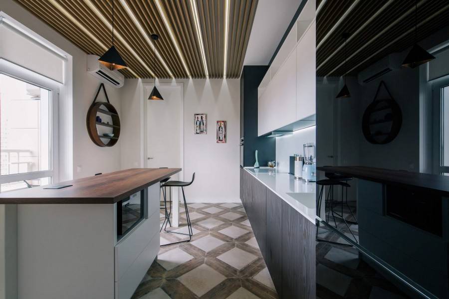 - Рейки выглядят привлекательно как самостоятельно, так и с дополнительными дизайнерскими элементами. Например, могут быть использованы точечные светильники.