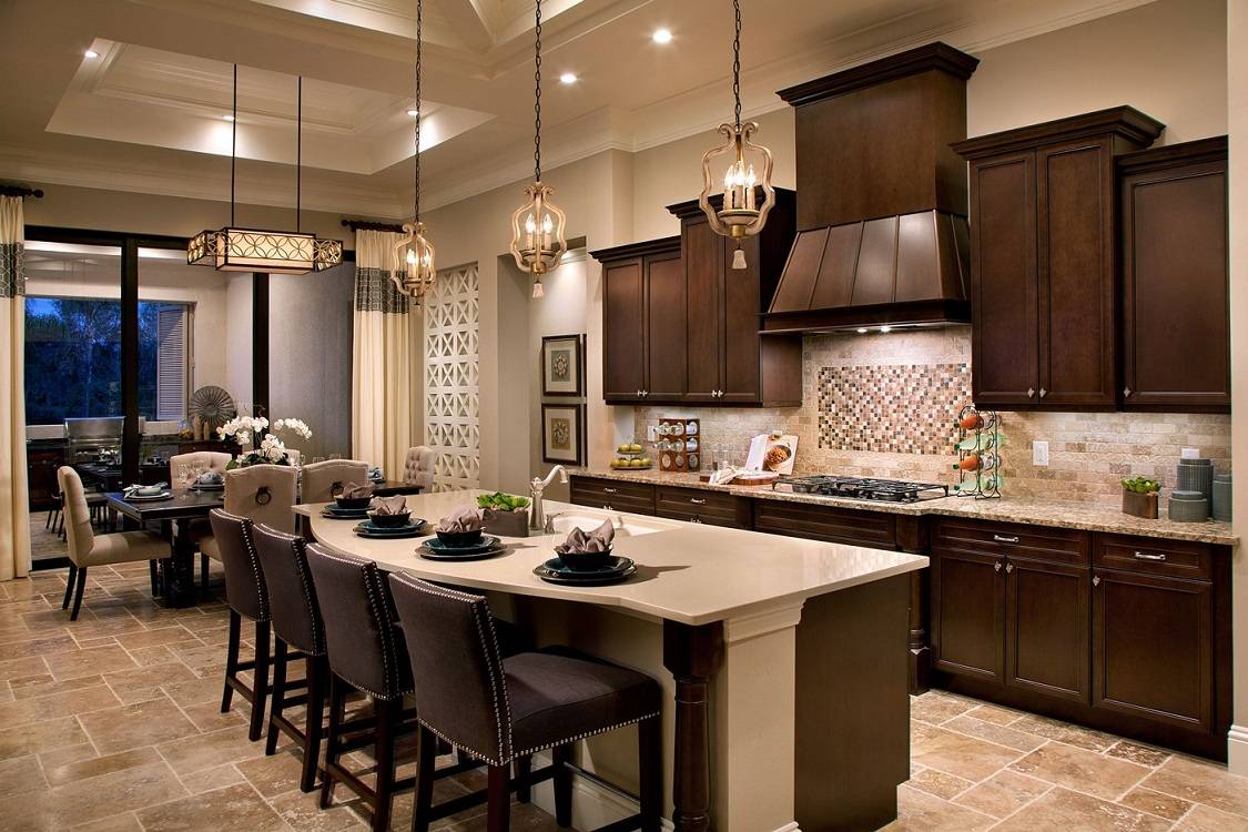 Кухня американской классики строится по островному типу размещения мебели. В ограниченных помещениях квартир обеденного стола может и вовсе не быть. Но вот кухонный остров или барная стойка будут обязательно. Если барная стойка имеет эпизодическую функциональность (во время всё тех же вечеринок), то кухонный остров действительно удобное решение для кухни.