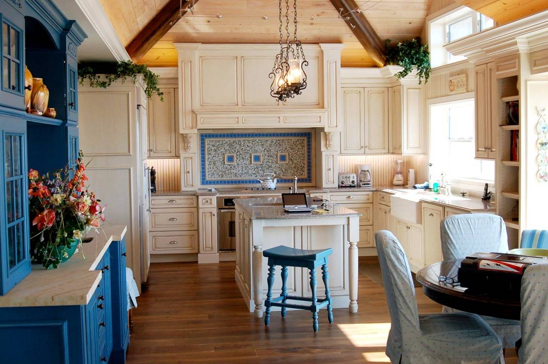 Природные материалы или их качественная имитация – неотъемлемая черта данного стиля. Также сюда можно отнести обилие света, изящную простоту мебели, отсутствие кричащих красок. Для отделки стен и фартука широко используют керамическую плитку с майоликой. Однако в просторных холодных помещениях лучше применять древесные панели и обои теплых расцветок.