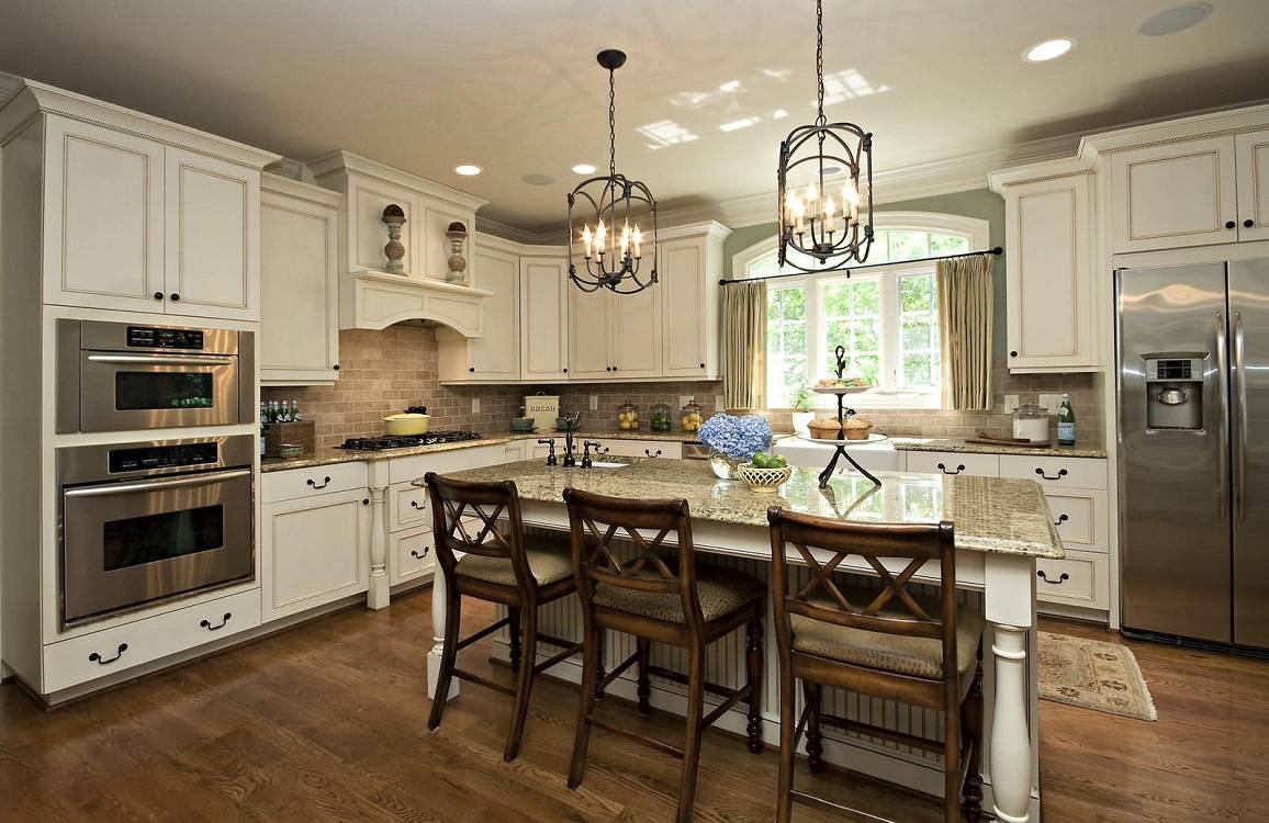 Важная особенность такой кухни — естественное освещение. Много естественного освещения. При небольших окнах добавляют люстру, бра, потолочные светильники и лампы дневного света.