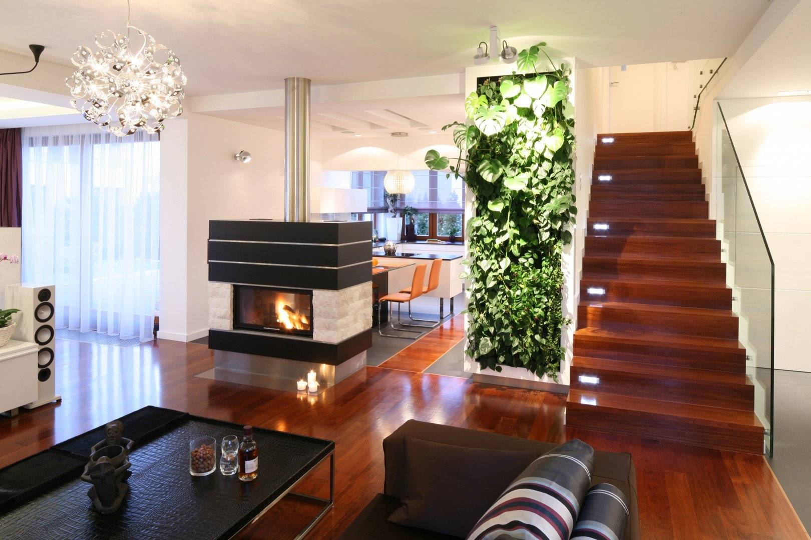 Главная и самая большая комната дома должна располагать к отдыху, общению, приему гостей. Здесь обязательна мягкая мебель, журнальный столик, книжные стеллажи. Желательно поставить бар, камин. Лестница, если она есть в доме, также выходит в гостиную.