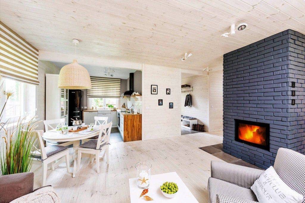 В загородном доме прихожая, комната для гостей, кухня объединены в одно просторное помещение