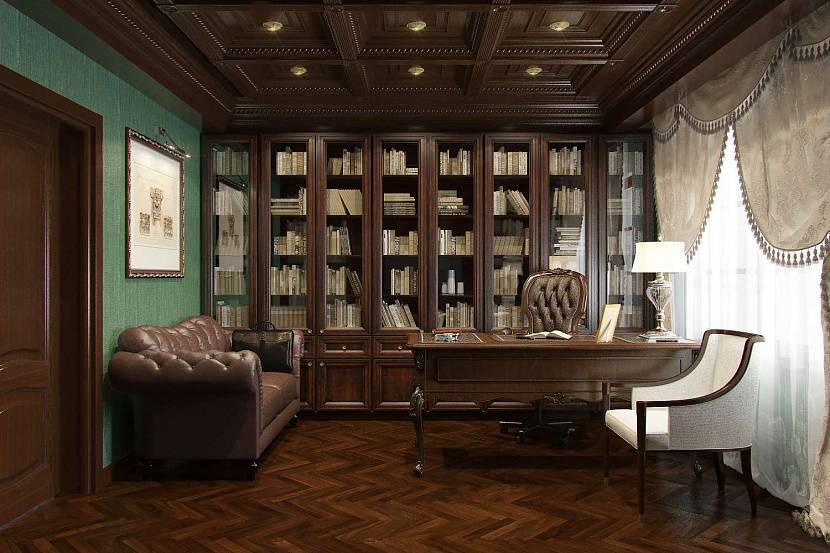 Кабинет может быть совмещён с библиотекой. В нем обязательно должен быть организован уголок для неспешной беседы с партнером или друзьями, или для распития вечернего аперитива.