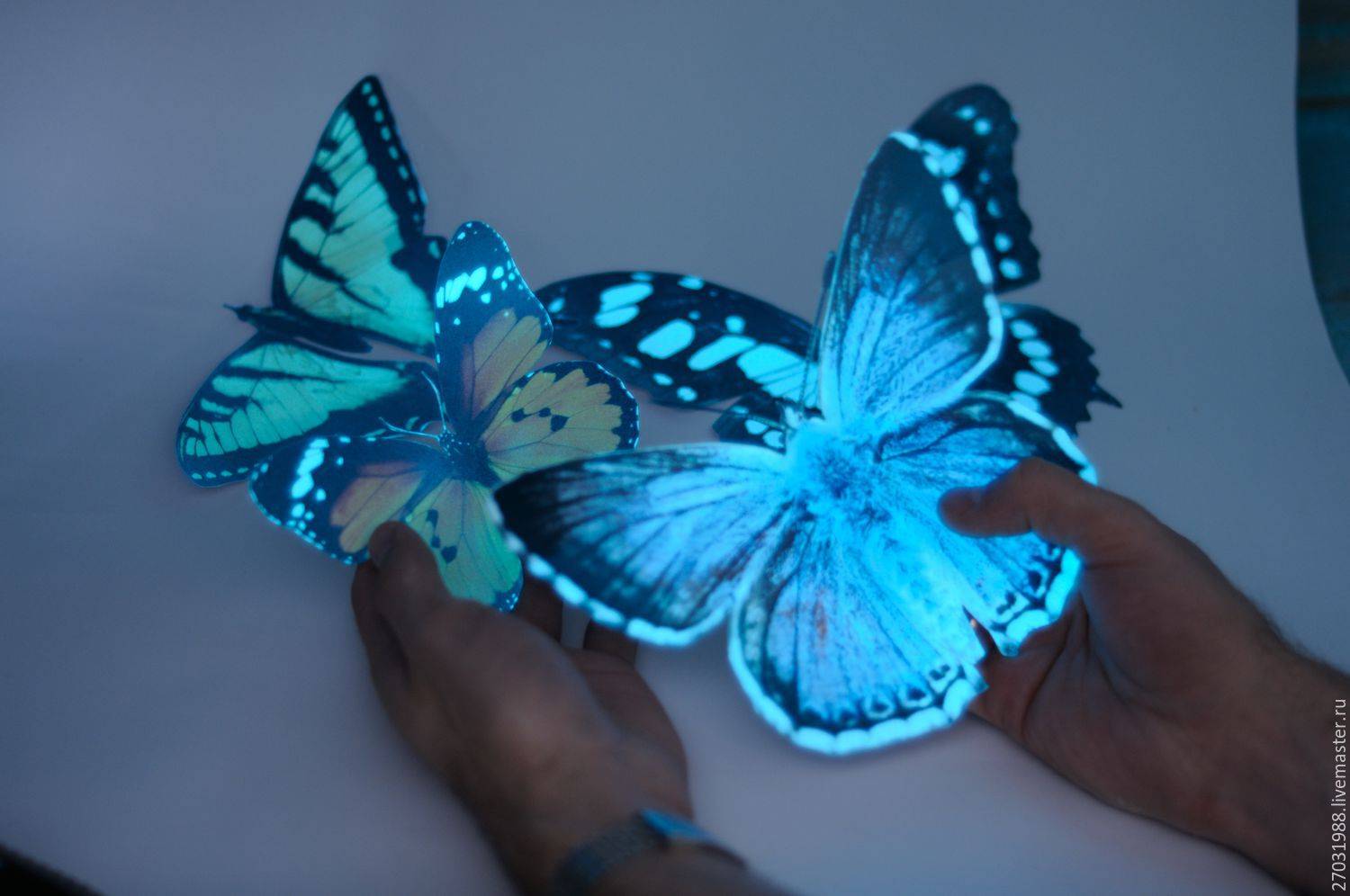 Дизайнеры советуют использовать светодиодную подсветку для придания изысканности бабочкам. Подсветка создает иллюзию настоящего парения. Спальня или детская комната с подсвечивающимися изделиями будут смотреться изыскано и уютно.