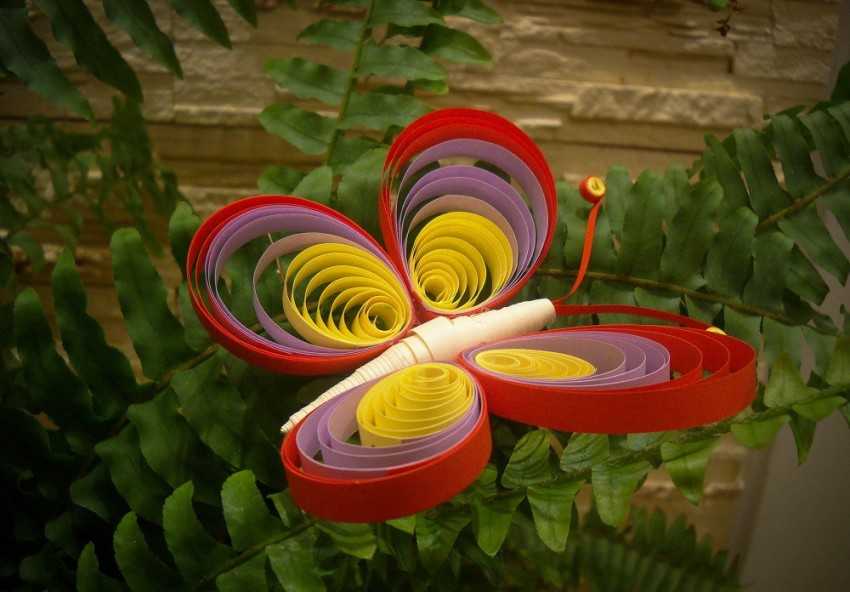Выбери или нарисуй трафарет, который будешь оклеивать модулями для квиллинга. Используй обычный клей ПВА и начинай сначала с крупных деталей, а после этого переходи к мелкому наполнению. При создании контуров используй булавки, чтобы сделать объемную бабочку без подложки.
