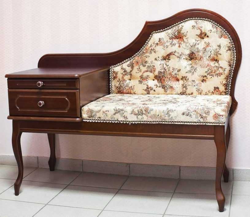 Модель с тумбочкой представляет собой оригинальный мебельный образец, который чаще всего оформляется «под старину». Изогнутые ножки, компактная тумбочка под телефон, книгу, ключи, красиво оформленное сидение, спинка, удобный подлокотник – такая банкетка напоминает дворцовую мебель. В первую очередь, она будет играть роль оригинального украшения интерьера и только потом функционального предмета.
