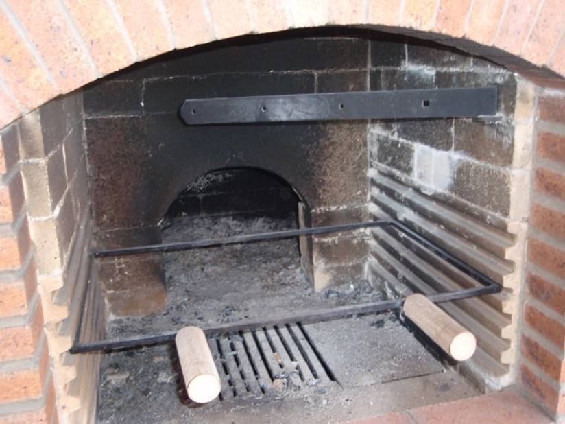 Под жаровню необходимо уложить лист из стали – там будет обустроен поддон. Поэтому после завершения кладки 5 или 6 ряда необходимо установить выступ для опоры под стальное полотно. Кирпич укладывается поперек, а после обустройства основания жаровни начинается сооружение самой печи. Применяется огнеупорный кирпич.