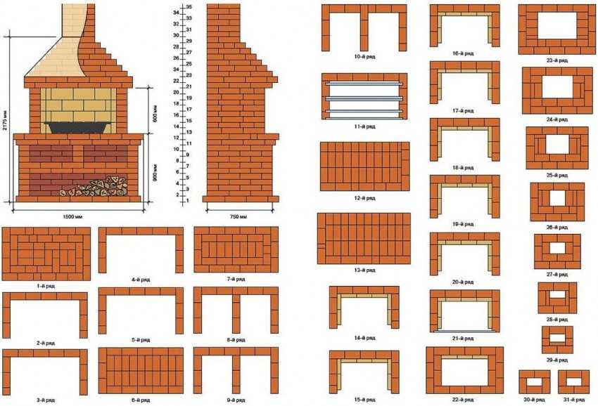 Совет. Для правильной укладки частей печи барбекю используйте схемы-порядовки, в которых наглядно показаны все ряды с числом и положением кирпичей.