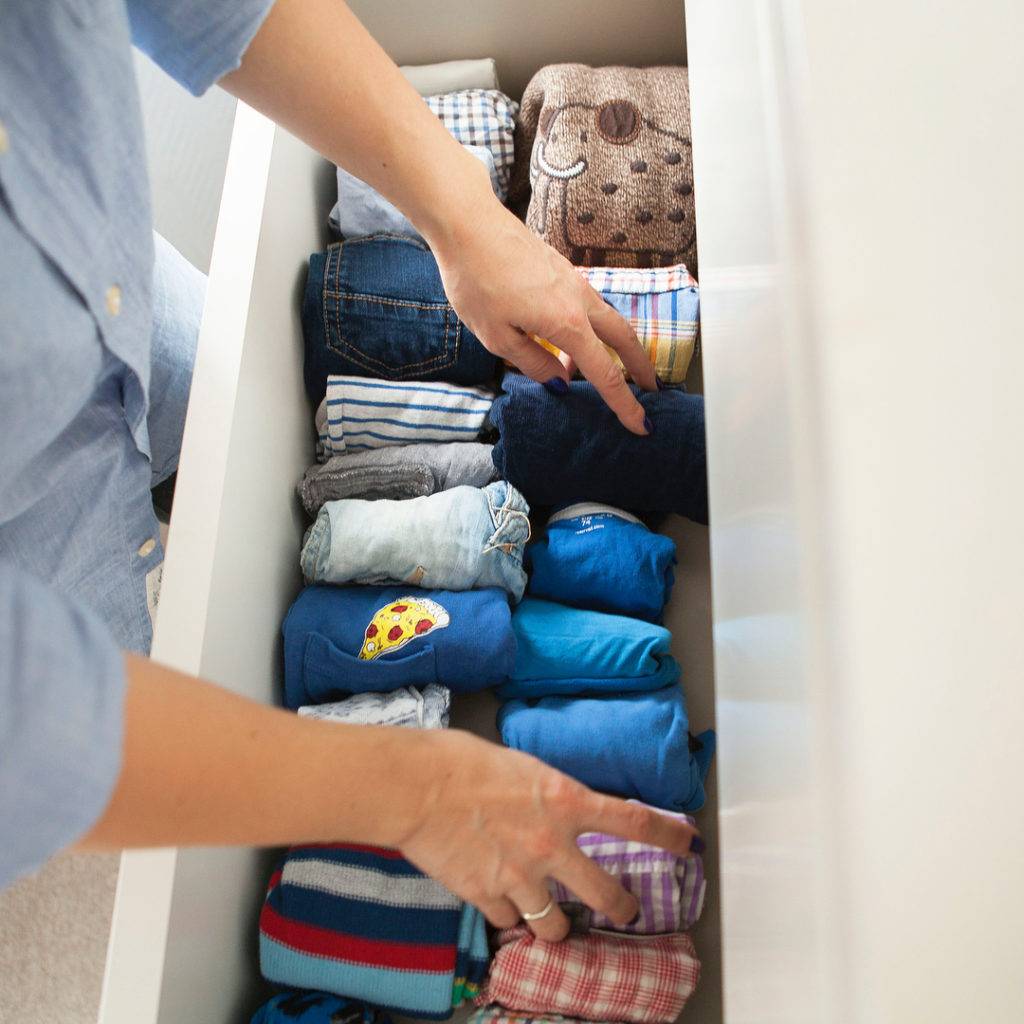 Можно хранить одежду по методу Мари Кондо, складывая её в небольшие прямоугольники и раскладывая в шкафу, ящиках и на полках вертикально. Вы сможете легко ориентироваться в вещах, потому что они всегда будут на виду. Простыни и наволочки можно хранить внутри пододеяльников того же комплекта.