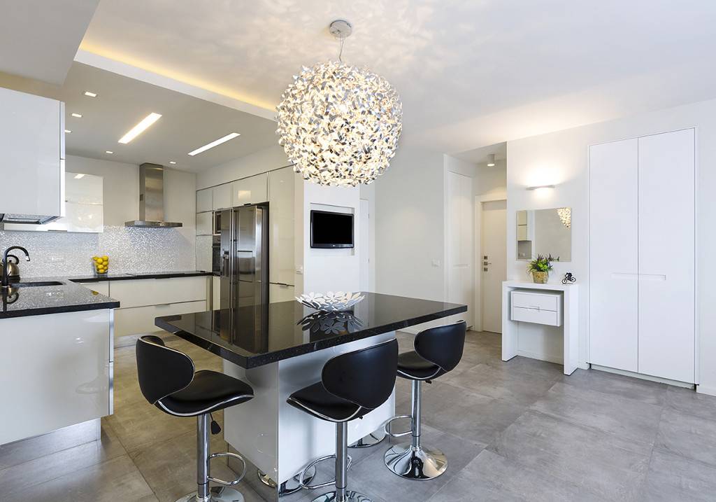 Итак, вы определились с выбором: черно-белый интерьер кухни ─ и все тут. Знайте: теперь у вас возможностей множество. Судите сами. Игра на визуальном восприятии пространства? Пожалуйста! Достаточно будет грамотного подбора пропорций этих диаметрально противоположных оттенков, пары акцентов на определенных аксессуарах или элементах декора, включая милый букетик живых цветов, смены некоторых элементов мебели – и в итоге, вы получите новую, до неузнаваемости, кухню.