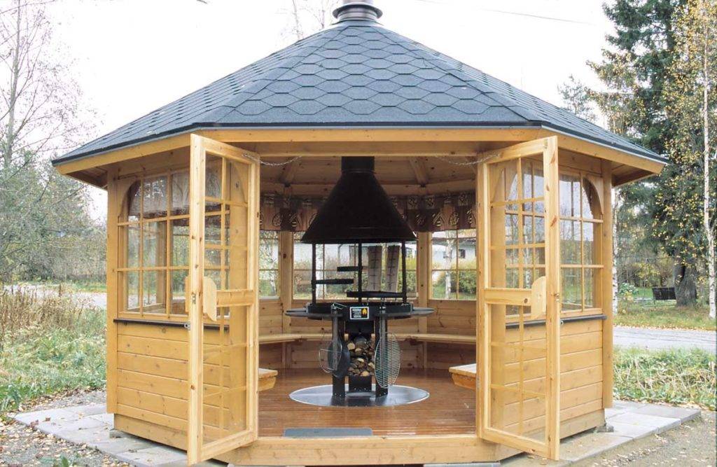 - не только в зимнее время, но и летом, во время сильного ветра или косого ливня, комфорт закрытого павильона приятнее продуваемого открытого навеса;