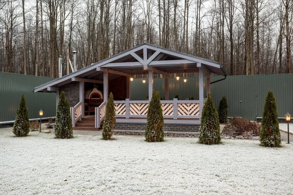 Слово «беседка» связано для многих людей с летним отдыхом, когда маленький навес над скамейкой служит защитой от палящих лучей солнца или промозглых капель дождя, под этим навесом часто размещают мангал и столик для настольных шахмат или домино. Но крытые павильоны для загородного отдыха делают и в зимнем исполнении. Это практически маленькие домики для семейного досуга на свежем воздухе с возможностью использовать их круглогодично. В зависимости от потребностей владельцы загородных домов размещают в такой беседке не только мангал для шашлыка, но и печку голландского типа, иногда коптильню. Разделочный стол и раковина упростят приготовление пищи и мытье грязной посуды. Если площадь павильона позволяет, то устанавливают холодильные камеры для хранения продуктов.