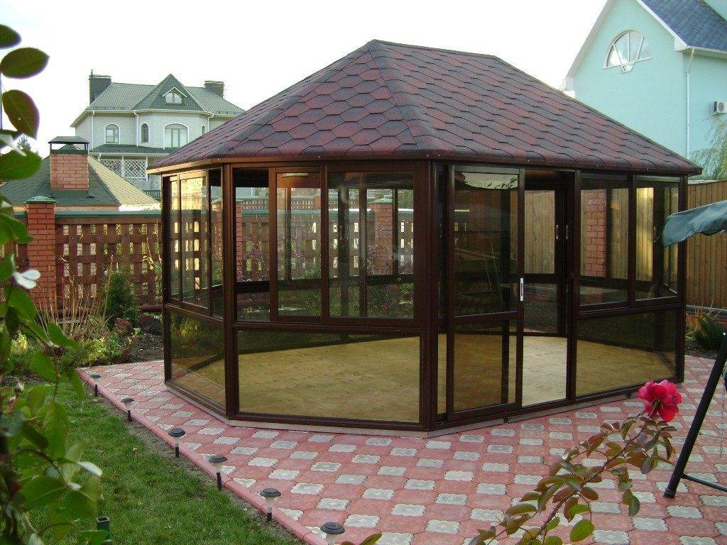 - поликарбонат. Срок службы этого материала не большой, так как устойчивость к перепадам температур и атмосферных осадков низкая. Преимущественно применяется для разборных беседок;