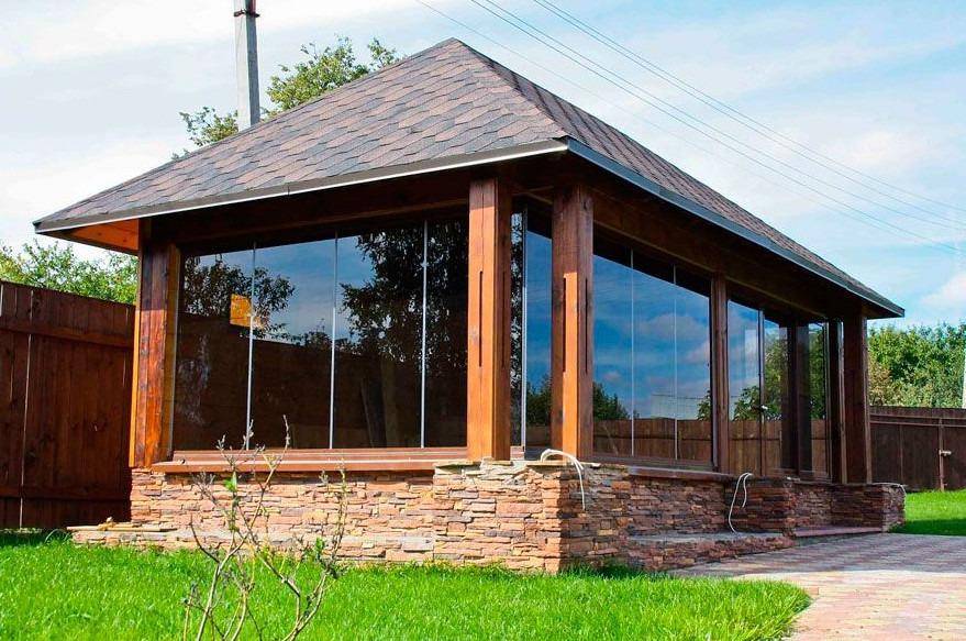 Бескаркасная беседка сложна в строительстве. Для нее делается ленточный фундамент, на котором возводятся стенки из кирпича или камня. Если кирпич декоративный, то он ничем не обшивается. Проемы заделываются чаще всего пластиковыми окнами.
