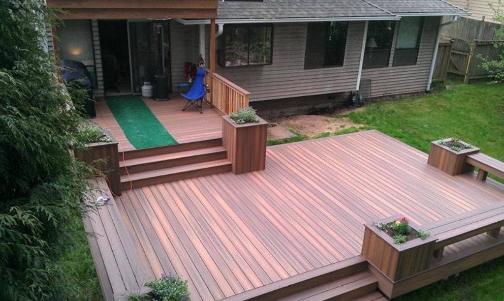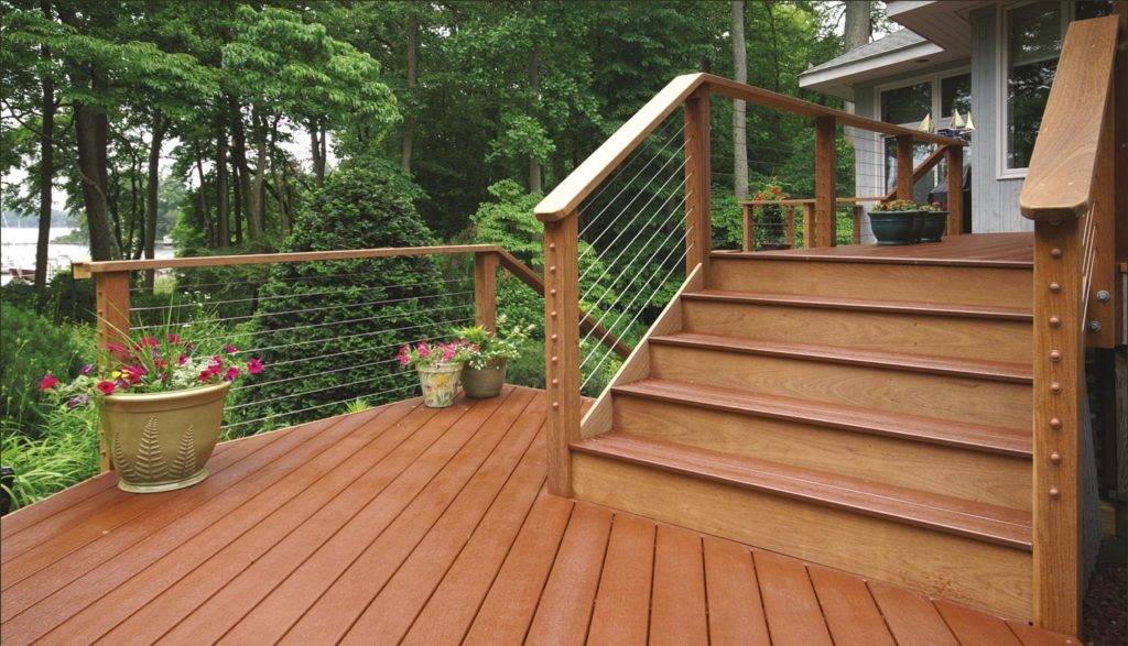 Дерево для отделки бетона применяется не часто, но оно способно сделать крыльцо более естественным в условиях загородного дома. Также практичным решением будет отделка крыльца и ступеней террасной доской.