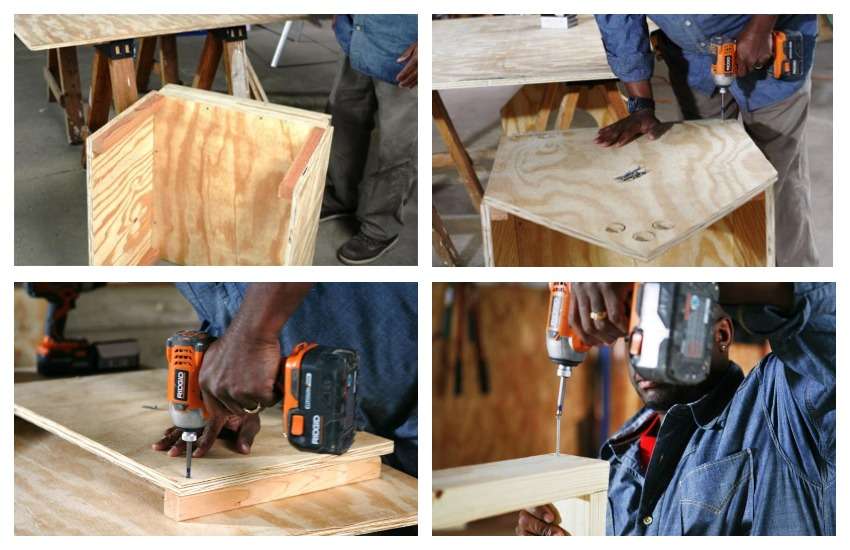 Первый этап — сборка каркаса. Нарезанные бруски соединяются саморезами. Можно сразу прибить доски пола, что придаст конструкции начальную устойчивость и облегчит дальнейшие работы.