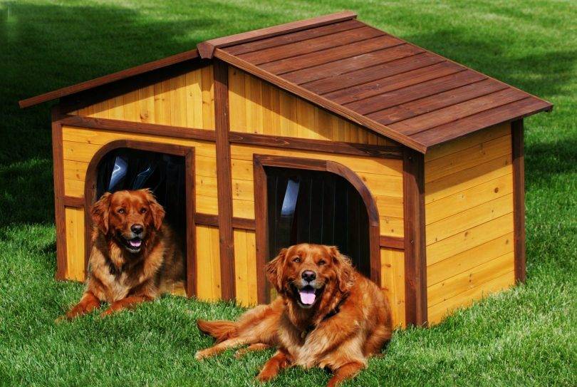 Вариантов двухместных будок на самом деле очень много, и каждая отдельная модель обладает массой достоинств. В данном случае просматривается прочность конструкции, невооруженным глазом видно, что само помещение внутри очень теплое. Высота домика говорит о наличии чердака, где сложен инвентарь обоих питомцев.