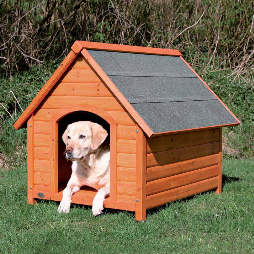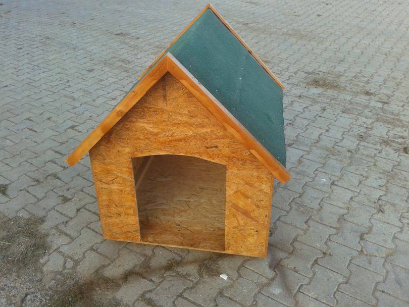 Крыша в собачьих будках бывает двускатной или односкатной. Конура с односкатной кровлей пользуется большей популярностью, так как собаки с удовольствием располагаются на ней. Да и чем меньше площадь помещения, тем быстрее прогревается в нем воздух. А учитывая то, что в конуре воздух нагревается от тепла, выделяемого телом собаки, в такой будке зимой будет намного теплее. В качестве материала используют древесину. Крыши из металлических материалов не используются, потому что в жару он накаляется, а в мороз совершенно не задерживает тепло. Скат кровли устанавливается в обратном направлении от входа. Так делается специально, чтобы во время осадков вода не попадала во внутрь конуры. Угол наклона такой крыши не меньше 10 градусов.