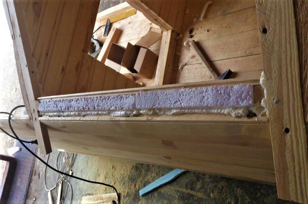 - На лицевой стенке из бруса собираем лаз, после чего все ячейки тоже утепляем пенопластом.