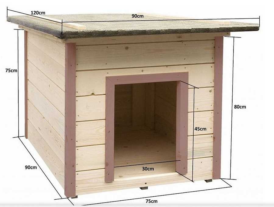Чтобы узнать рекомендуемую высоту конструкции, ориентируйтесь на высоту питомца. Обычно они достигают 55 см, но у каждого питомца свои параметры. За ориентир возьмем именно этот показатель. К высоте следует прибавить высоту подстилки (может служить сено, стружки или ткань) для питомца и накинуть еще 15 см для комфортного передвижения по конструкции и возможности сидеть, не касаясь потолка. Например, 55+10+15=80 см — оптимальная высота будки.