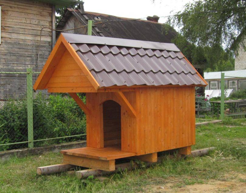 Двускатная крыша сложнее односкатной, но зато она не позволяет скапливаться дождю и снегу, что обеспечивает дополнительный комфорт и долговечность. Сделать собачью будку из дерева (на фото) можно своими руками по такой инструкции: