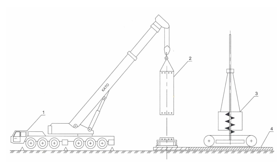 | 1 | после установки буровой машины в рабочее положение с помощью стрелового крана устанавливают нижнюю часть обсадной трубы с ножевой секцией, последующие секции объединяют между собой конусными резьбовыми пробками (общая длина обсадной трубы назначается из условия возвышения ее над уровнем рабочей площадки на 1,5 м для возможности размещения обжимного хомута); |