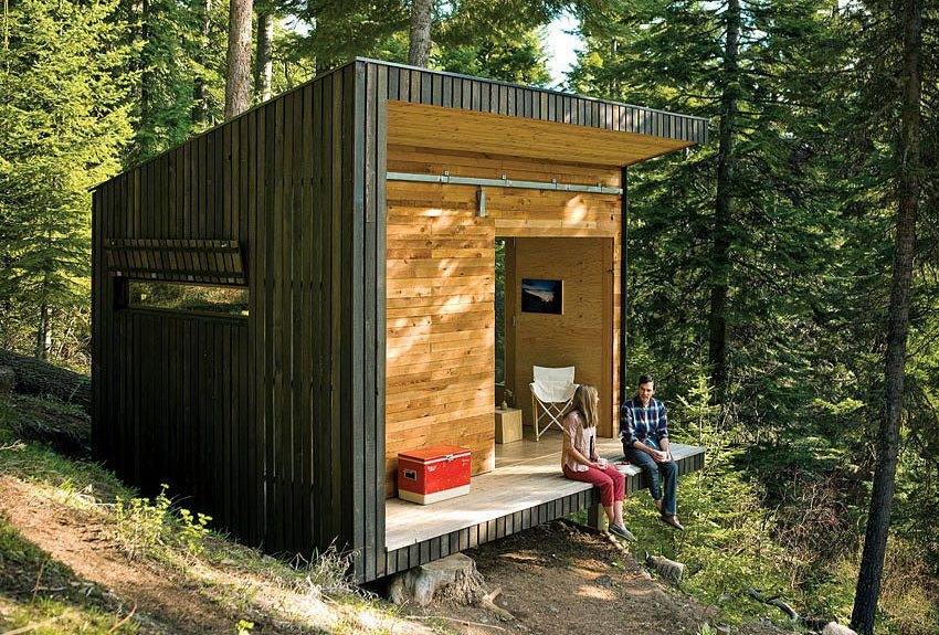 Проект бытовки необычного дизайна с открытой площадкой для отдыха на свежем воздухе.