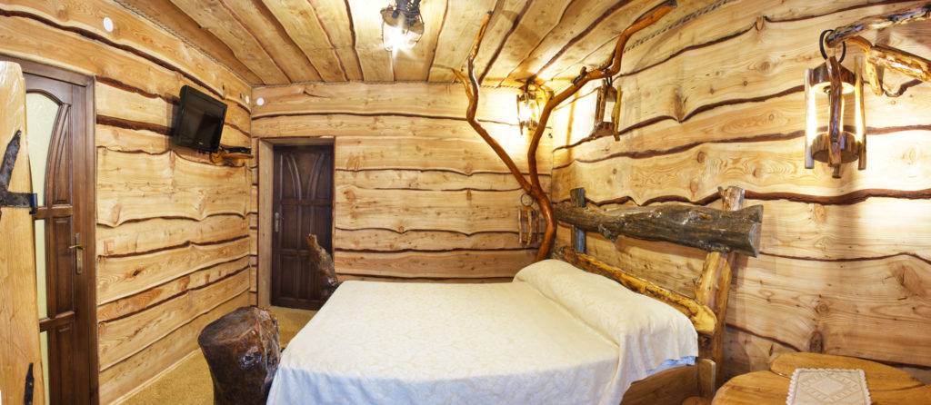 Один из комбинированных вариантов оформления потолка в деревянном доме – это сохранение выступающих балок на фоне гипсокартонного поля. В этом случае, покрытие гипсокартона должно быть на ряд тонов светлее, а балки нужно проработать одним из более тёмных оттенков так, чтобы деревянная текстура была сохранена.