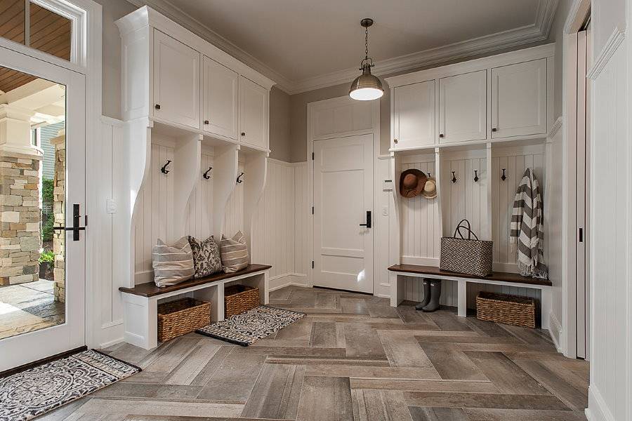 Для прихожих часто выбирают полотно с имитацией каменной кладки, древесину, песок. Популярен орнамент под панно. Стыковку с остальными материалами облицовки проводят молдингами. Для панелей подходит влажная уборка, а поверхность такая прочная, что выдерживает атаки когтей домашних питомцев.