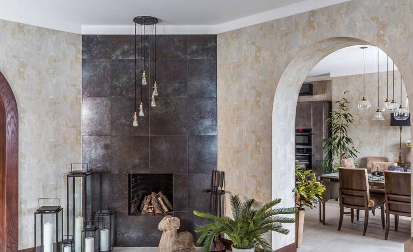 - Теплый свет встроенных ламп позволяет текстуре «дикого» камня раскрыться и заиграть, а полутени от подвесных светильников добавляют помещению сказочность и мистику. Для напольного покрытия выбран шифер с оттенком ржавчины, который хорошо сочетается с цветом стен.