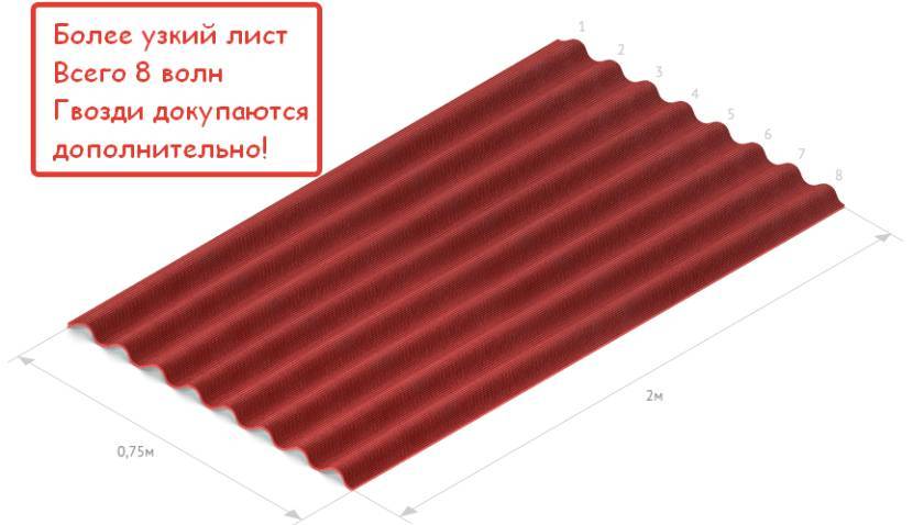 Марка меньше по ширине. Габариты изделия 1,95×0,76 м, волн всего 8, высота и ширина волны такая же, как в модели Смарт. Масса листа 5 кг. Вариант отличается хорошей ветроустойчивостью, практичностью, долгим сроком эксплуатации.
