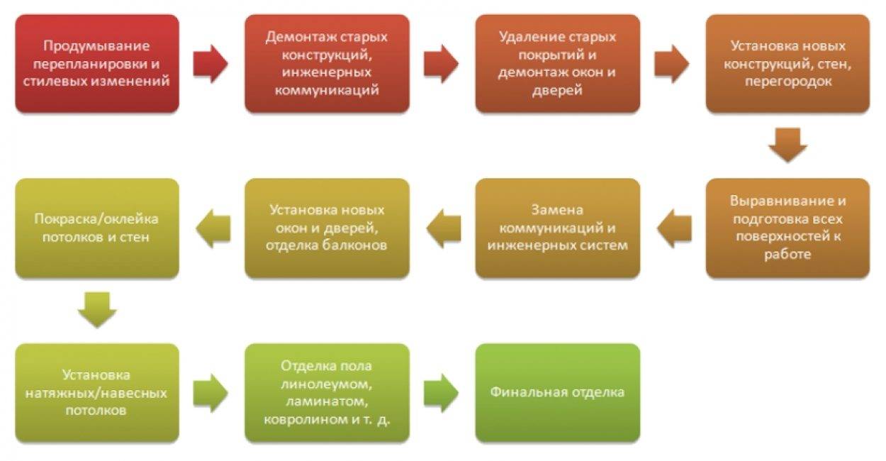 После тщательной подготовки выделяют следующие этапы чернового ремонта: