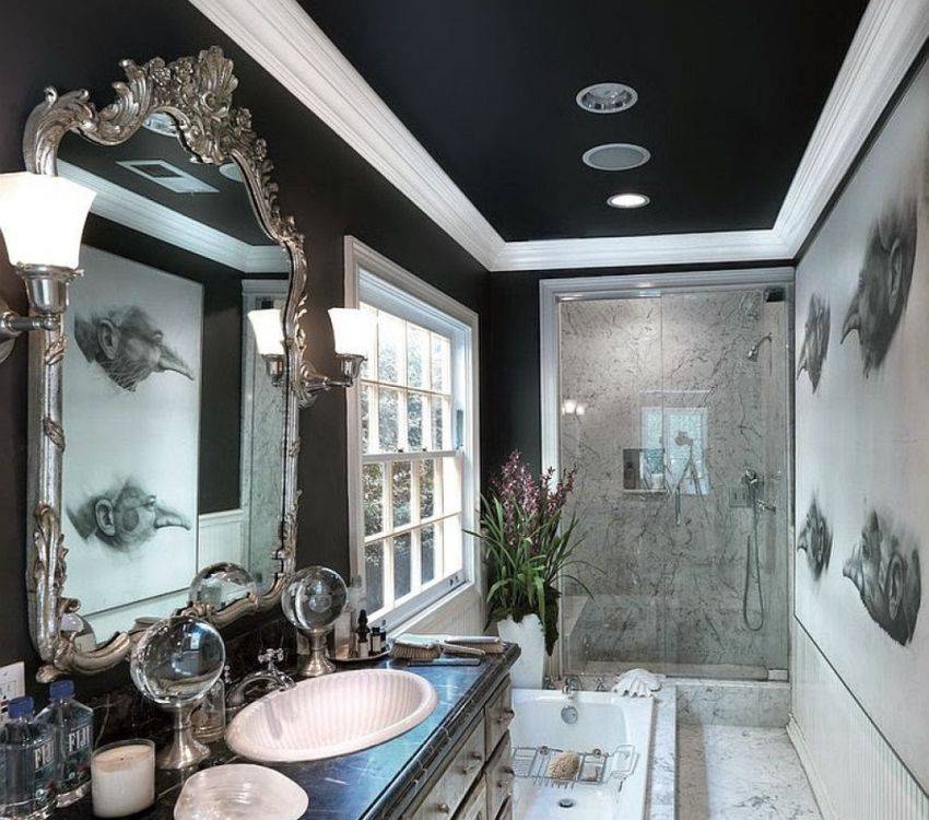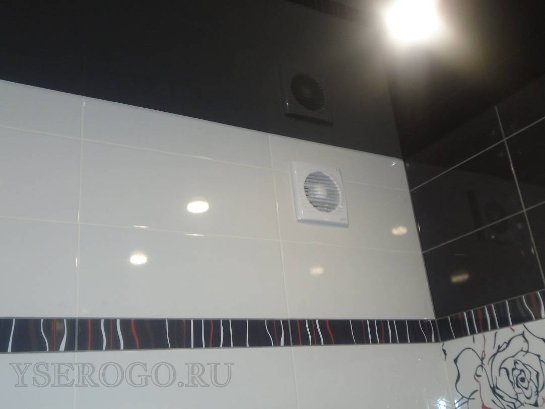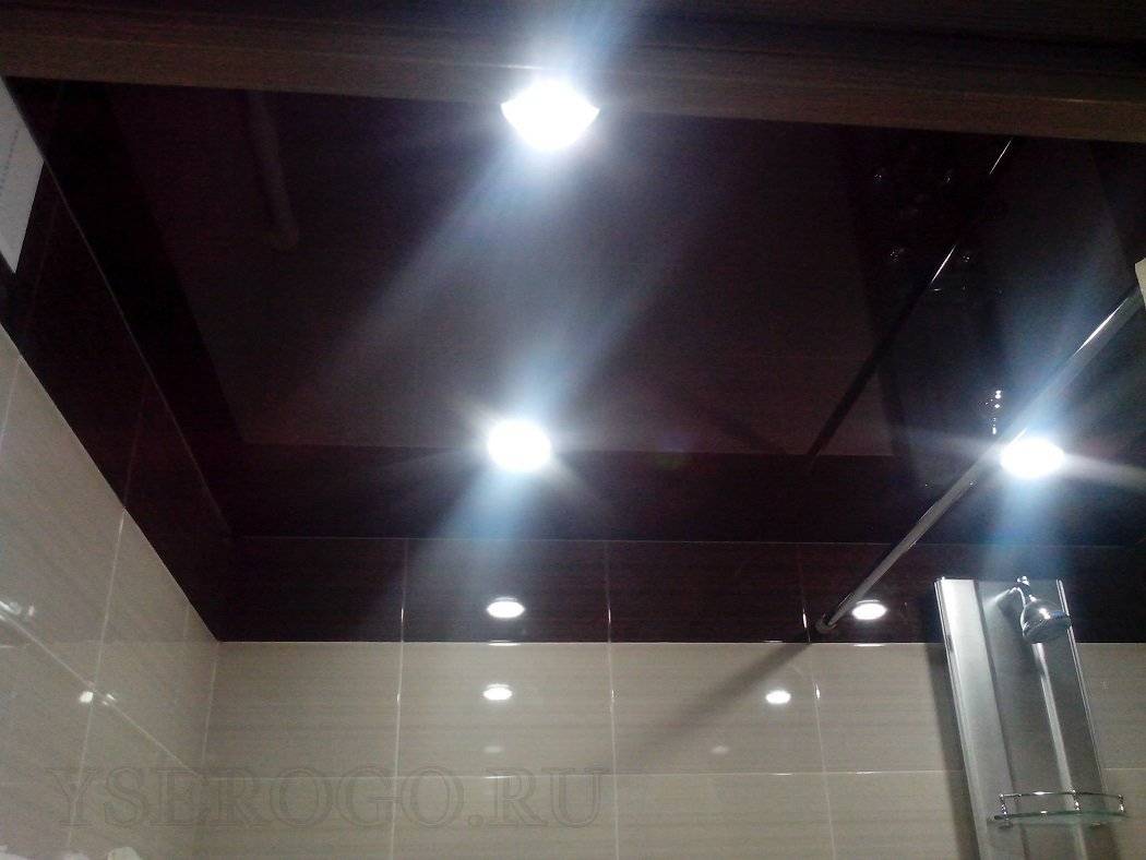 Для ванной берут лаковое полотно. Оно гармонирует с черно-белой глянцевой облицовкой стен. Или используют еще один популярный тандем — красный с черным. Можно и в ванной комнате установить конструкцию «звездное небо».