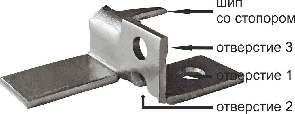 Элемент представляет собой фурнитуру с двумя основаниями, расположенными под углом и направленными в разные стороны. На одном из них расположен шип высотой 11 мм, а на другом – три отверстия: