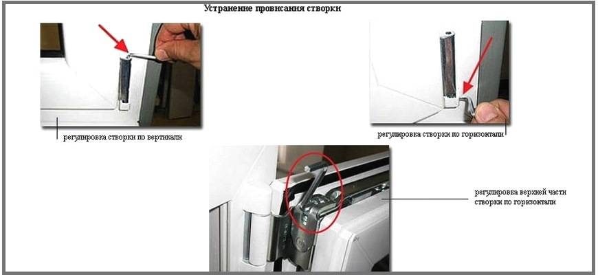 При проседании пластикового окна регулировка другая: нужно сдвинуть створку в стону, чтобы те выступы, которые не достают до пластин, зацепились за них.