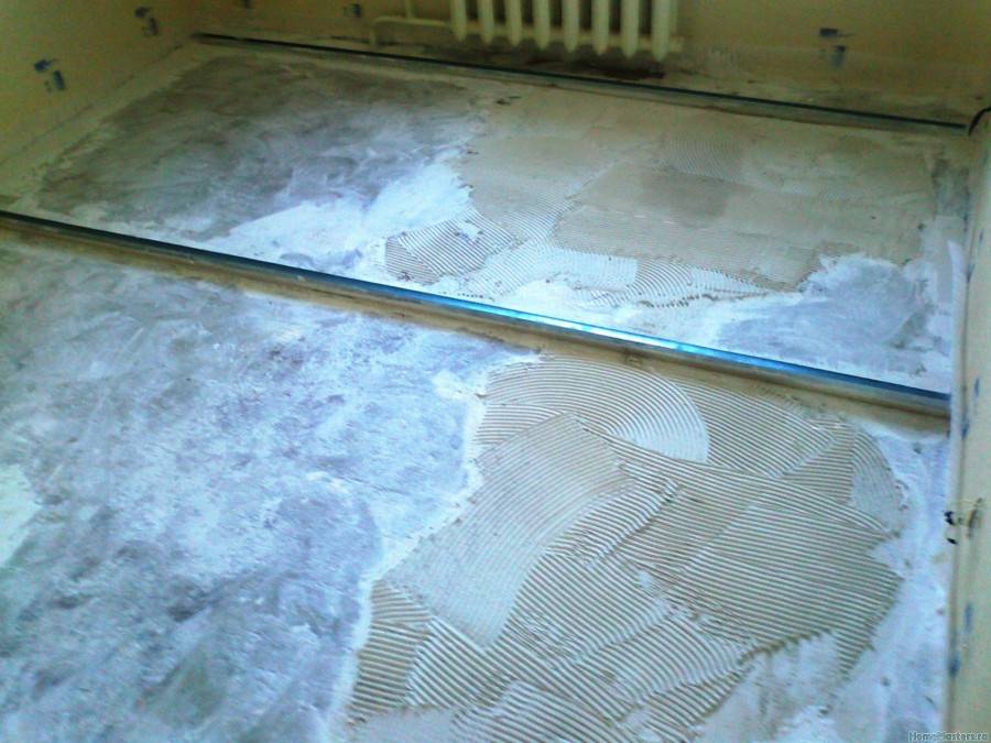 Для распределения раствора пользуются зубчатым шпателем, а валик поможет устранить воздушные пузырьки. Когда стяжка сформирована, можно наносить финишную смесь. Она имеет жидкую форму, что требует предварительного решения вопроса гидроизоляции.