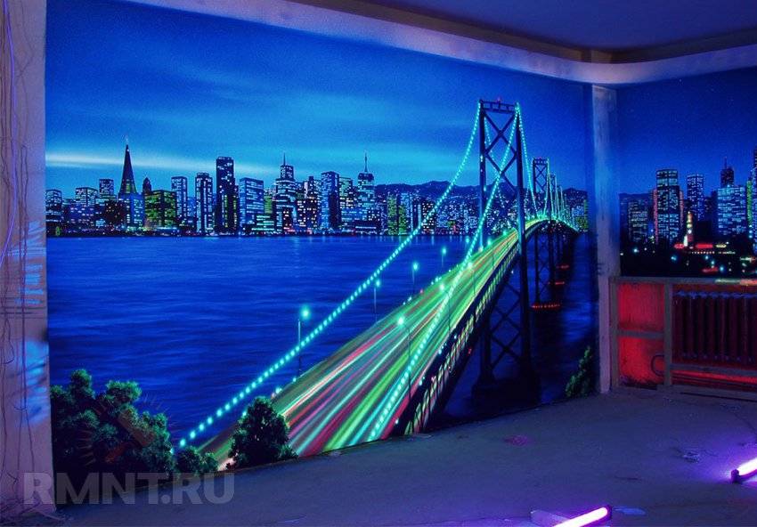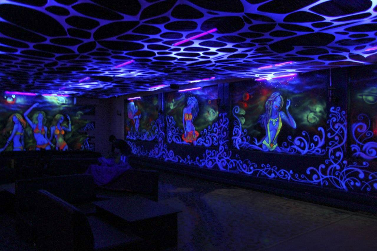 Чтобы световой эффект был выражен наиболее ярко, отделывать нужно светлые поверхности. При покраске темного участка под слой неонового материал наносим светлый грунт из акрилового пигмента.