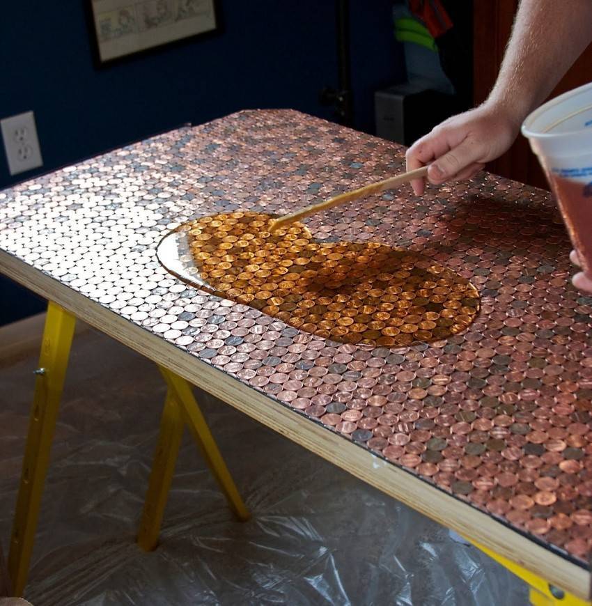 При реставрации старой столешницы, с ее поверхности удаляется краска, лак и любые другие материалы. Поверхность можно украсить камушками, монетами, можно нанести орнаменты с помощью фрезера. Под прозрачным слоем смолы, данные композиции будут смотреться необычайно красиво.
