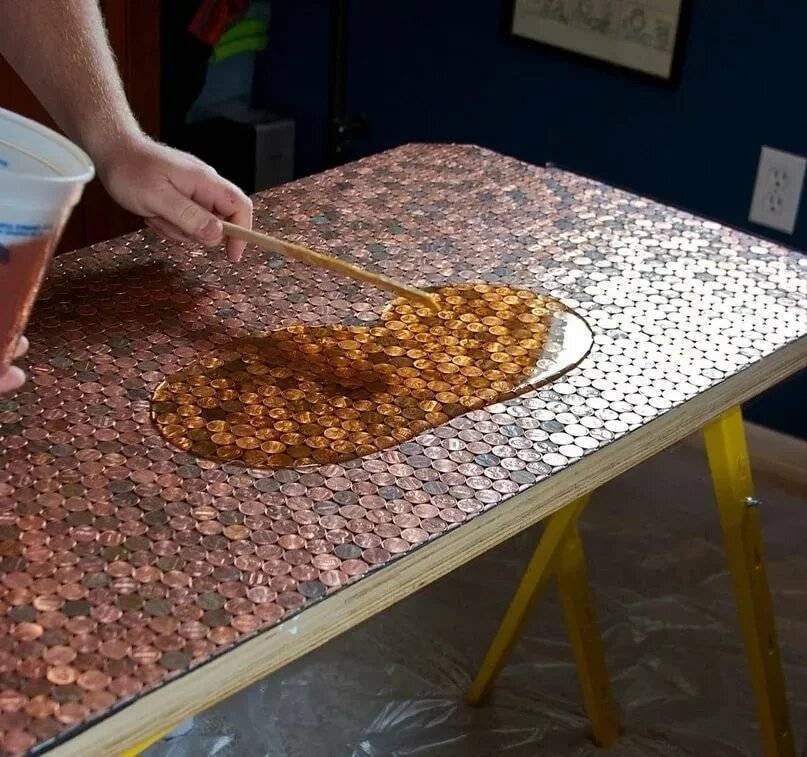 При реставрации старой столешницы, с ее поверхности удаляется краска, лак и любые другие материалы. Поверхность можно украсить камушками, монетами, можно нанести орнаменты с помощью фрезера. Под прозрачным слоем смолы, данные композиции будут смотреться необычайно красиво.