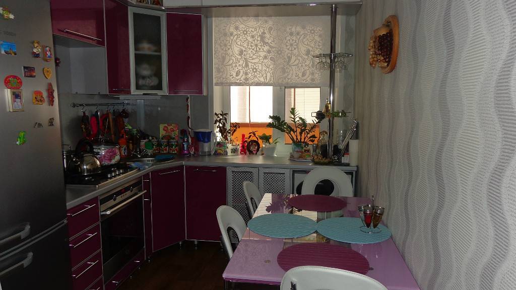 К примеру, если все фасады гарнитура — фиолетовые, то присутствие этого оттенка в других элементах интерьера придется ограничить. Можно добавить его в виде неброского орнамента на светлых стенах, он может присутствовать и в текстиле.