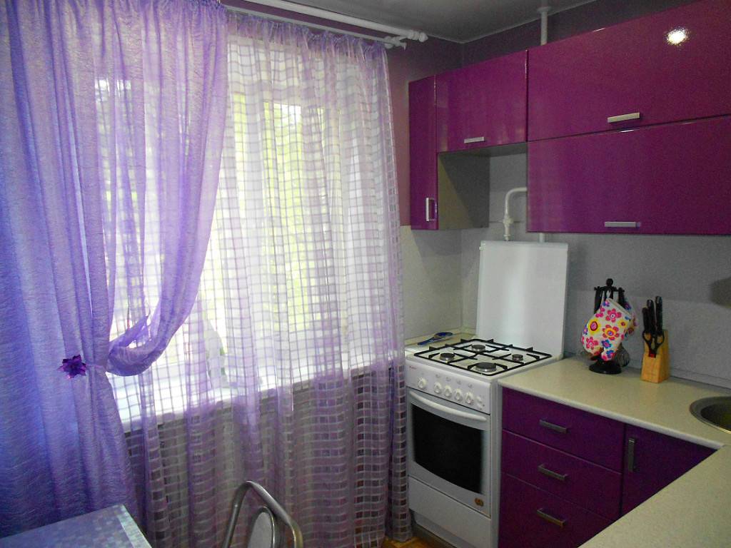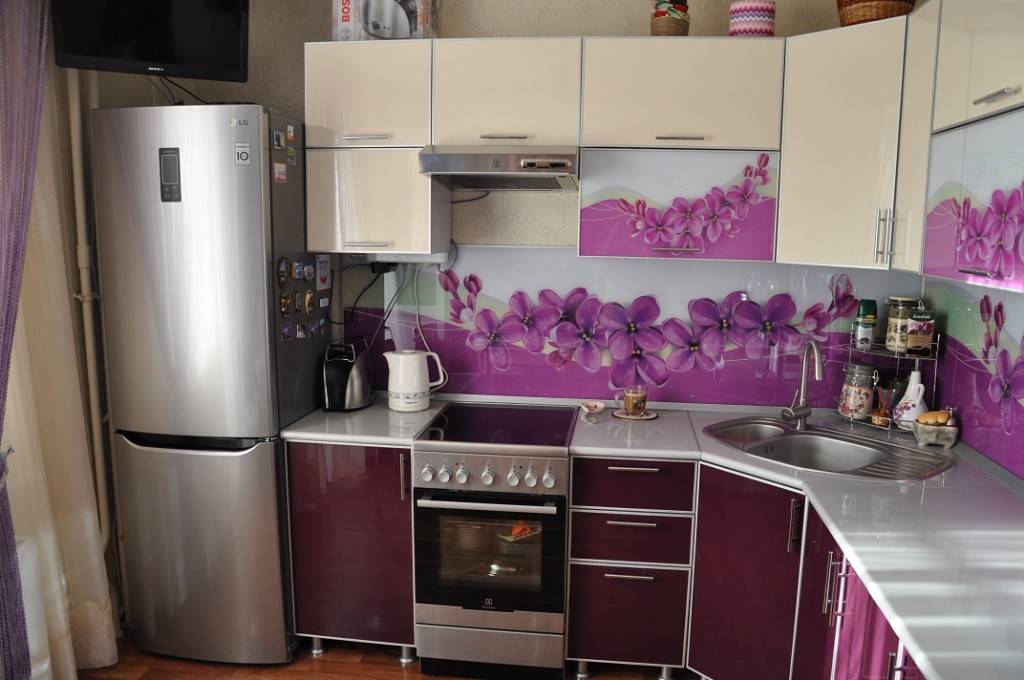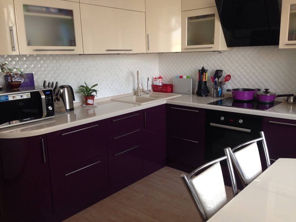 Отличный вариант для обустройства кухни — выполнить только нижние или только верхние фасады кухни в фиолетовых тонах. Остальная часть может быть белой, серой, лиловой. Что касается материала изготовления такого гарнитура, то тут следует руководствоваться выбранным стилем интерьера.
